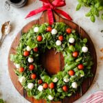 A festive and simple Caprese Salad Wreath perfect for holiday parties, featuring fresh arugula, grape tomatoes, mozzarella pearls, and basil, drizzled with balsamic vinaigrette for a colorful and delicious appetizer.