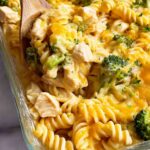 This comforting Chicken Noodle Casserole combines tender rotini pasta, fresh broccoli, cooked chicken breast, and a creamy homemade cheese sauce baked to perfection with melted cheddar cheese on top.