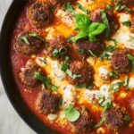 - Bake with Sauce and Cheese: Pour the San Marzano tomato sauce into the skillet to about ½ inch depth. Using tongs, carefully nestle the fried meatballs in the sauce, spacing them apart. Scatter torn pieces of fresh mozzarella between the meatballs.