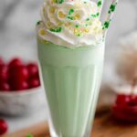 - Serve and garnish: Top each milkshake with whipped cream, sprinkle green decorator sugar or other festive sprinkles, and place a maraschino cherry on top if using. Serve immediately to enjoy the refreshing minty flavor.