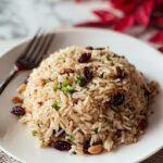 A flavorful and buttery rice pilaf with dried cranberries and toasted slivered almonds, perfect as a festive holiday side or a quick weekday accompaniment.