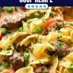 This comforting Beef Noodle Soup features tender chunks of sirloin simmered with aromatic vegetables, fire-roasted tomatoes, and peas in a creamy, flavorful broth. Perfect for a satisfying meal, it combines melt-in-your-mouth beef with chewy egg noodles in a rich sauce ideal for family dinners or cozy nights in.