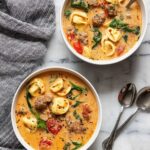 A warm and comforting slow cooker creamy tortellini soup packed with Italian sausage, tomatoes, cheese tortellini, and baby spinach, perfect for an easy and hearty meal.