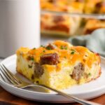 - Pour Egg Mixture: Pour the egg mixture evenly over the layered bread, sausage, and cheese ensuring it soaks through the casserole.