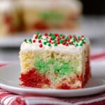 - Serve: Just before serving, decorate the cake with red and green sprinkles or other festive decorations. Slice and enjoy your Christmas Poke Cake!