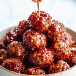 This Grape Jelly Meatball recipe features tender homemade meatballs coated in a sticky, sweet, and tangy sauce made from grape jelly, barbecue sauce, red wine vinegar, soy sauce, and buffalo wings sauce. Perfect as a crave-worthy appetizer or a comforting dinner served over mashed potatoes and veggies, these meatballs are juicy and full of flavor, guaranteed to disappear quickly.