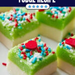 - This fudge is perfect for Christmas parties, cookie trays, or holiday movie night snacking thanks to its festive green and white layers with heart sprinkles.
