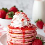 - Serve: Serve your strawberry pancakes hot topped with whipped cream, fresh strawberries, and maple or strawberry syrup for extra flavor.
