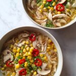 A flavorful Thai style chicken noodle soup that is gluten free and dairy free, featuring tender shredded chicken, aromatic garlic and ginger, fresh mushrooms, sweetcorn, and gluten free flat rice noodles simmered in a savory tamari soy sauce broth. Perfect for a comforting and healthy meal.